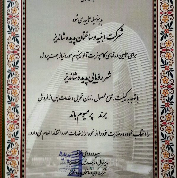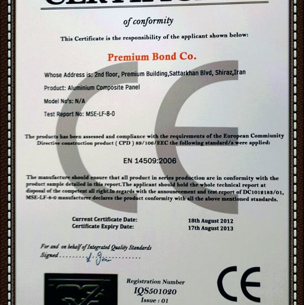 ورق های کامپوزیت پرمیوم باند پس از طی آزمایشات و تست های متعدد موسسات معتبر بین المللی و داخلی از قبیل دانشگاه مهندسی مواد شیراز ، موسسه تحقیقاتی رنگ امیر کبیر – مترا ، مرکز پژوهش متالوژی رازی ، شرکت خدمات آزمایشگاهی اقیانوس سبز و مطابق با نتایج موفقیت آمیز حاصل ، موفق به اخذ استاندارها و گواهینامه های ملی و بین المللی گردیده است .